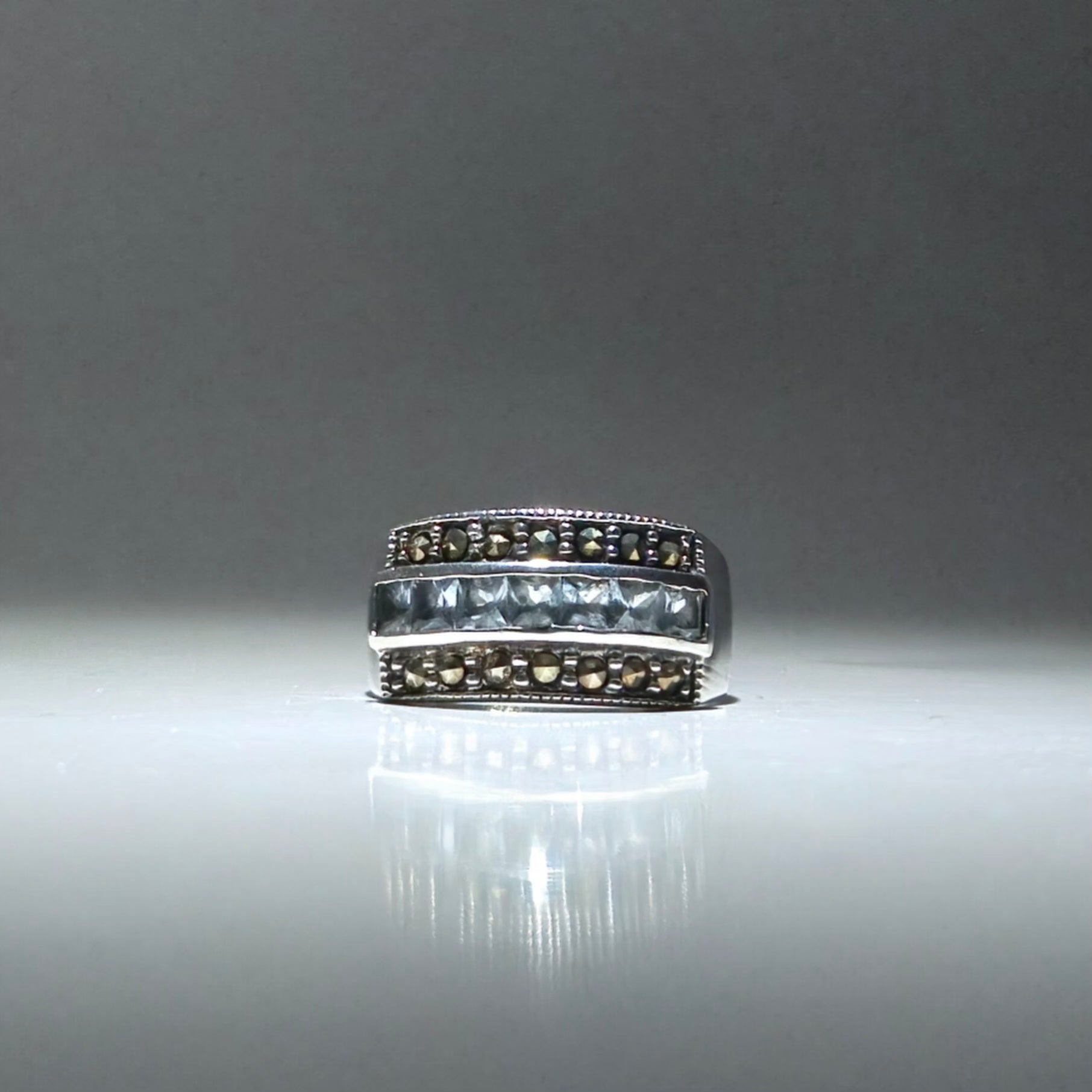 Elevate your style with our stunning Silver Ring. Crafted from 0.925 silver and adorned with pyrite and zirconia stones, it weighs 6.95 grams and is size 8. Mined and gathered in Mexico, each ring is unique and adds a touch of elegance with its beautiful stones.